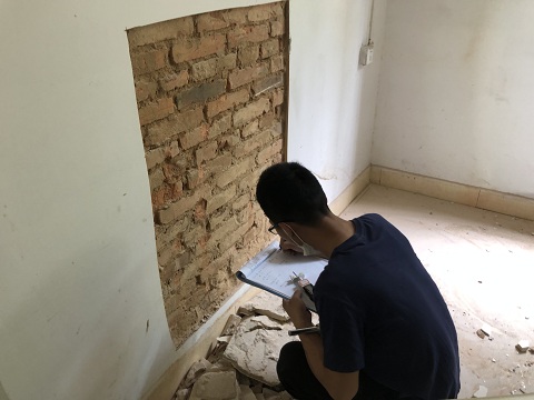 某房屋建于20世紀(jì)90年代,作為住宅使用。房屋承重墻體主要采用燒結(jié)多孔磚與混合砂漿砌筑,除廚衛(wèi)區(qū)域樓板為鋼筋混凝土現(xiàn)澆板,其余樓板均為預(yù)制板。根據(jù)介紹,該房屋業(yè)主在房屋裝修時(shí)將房屋部分墻體拆除。結(jié)合委托方提供的資料,并根據(jù)現(xiàn)場(chǎng)檢測(cè)的實(shí)際情況,可知: