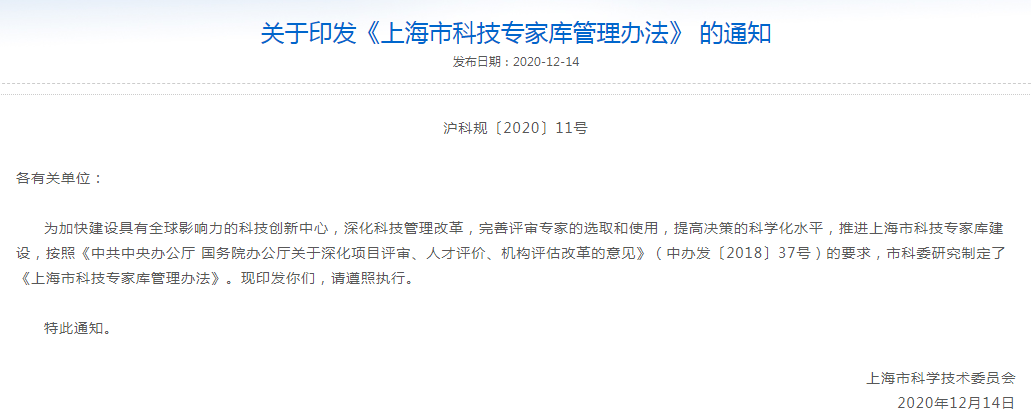 上??萍紝?zhuān)家?guī)斐筛黝?lèi)高層次人才,服務(wù)于上海市科技管理,是上海市科技管理信息系統(tǒng)的重要組成部分,在提升科技管理水平、優(yōu)化科技資源配置、促進(jìn)科技事業(yè)發(fā)展方面起到重要作用,對(duì)科技管理部門(mén)提升科技決策水平和科技創(chuàng)新能力具有重要意義。2018年底,上海市科學(xué)技術(shù)委員會(huì)發(fā)布《上海市科技專(zhuān)家?guī)旃芾磙k法(試行)》,分別從目的依據(jù)、適用范圍、專(zhuān)家入庫(kù)、專(zhuān)家更新、專(zhuān)家出庫(kù)、專(zhuān)家選取與使用等方面進(jìn)行了規(guī)定。通過(guò)專(zhuān)家?guī)旖ㄔO(shè),積極鼓勵(lì)引導(dǎo)國(guó)內(nèi)外專(zhuān)家服務(wù)上海科技創(chuàng)新中心建設(shè)。